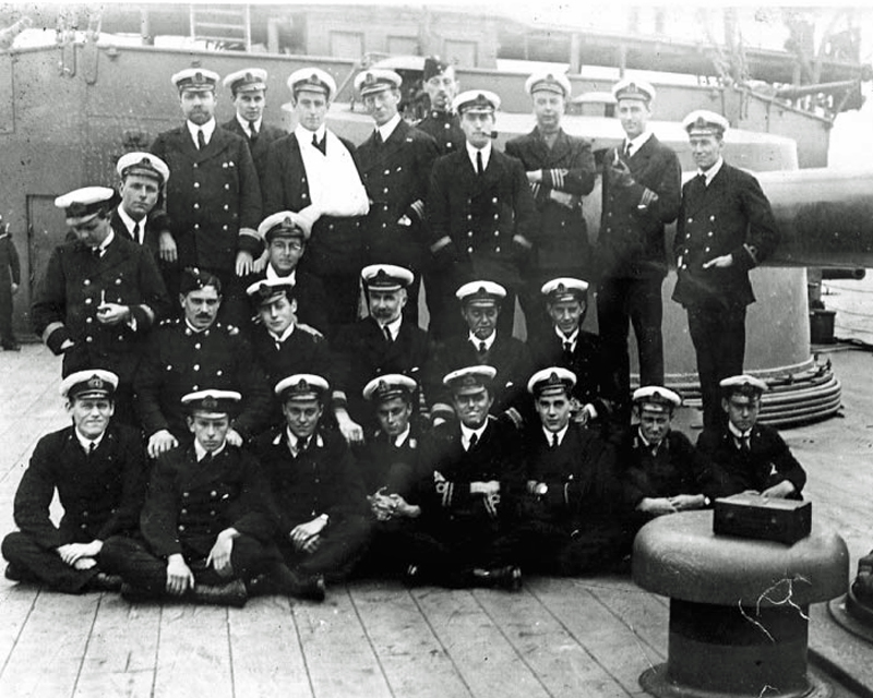 Cradock's ships left the Falkland Islands on 23 October 1914 and on 1 November - off Coronel, on the Chilean coast - Good Hope and Monmouth were sunk with all hands. Allardyce now feared the worst, and made plans to withdraw, with his staff, to Mount William. He ordered the Treasury to burn all paper currency and bury the bullion. After some sleepless nights, and a few false alarms, Allardyce was relieved to see a powerful British naval squadron, under the command of Admiral STURDEE, arrive in the Falkland Islands. The ships arrived just in time, because the next day lookouts on Sapper Hill reported that five German cruisers, under the command of Admiral von SPEE, were steaming towards Port Stanley. The first shots were fired on 8 December 1914 by the Canopus which was in Stanley harbour. In the ensuing battle most of the German ships and their colliers were sunk. Subsequent interrogation of prisoners of war revealed how accurate Allardyce's assessment had been. The German intention had been to destroy the Wireless Station and to demand the unconditional surrender of the Colony. Failure to surrender would have resulted in a large force being landed and Stanley was to be razed to the ground. It gave Allardyce particular pleasure in his correspondence after the battle to note that 'throughout this extended period 5th August to 19th December our small 5kw Wireless Station, which I had such great difficulty in obtaining and erecting, covered itself with glory.'