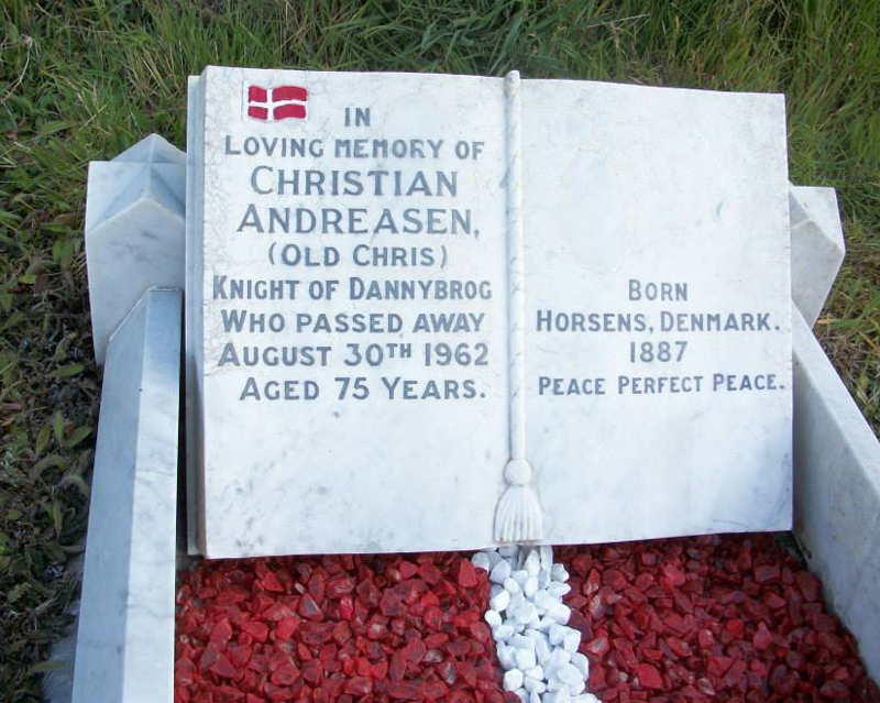 Emily Andreasen died in 1978 and she and her husband are buried in Stanley cemetery.Chris Andreasen's grave, with his country's flag painted on the stone, is still sought out by visiting Danish mariners to whom his name has become something of a legend.