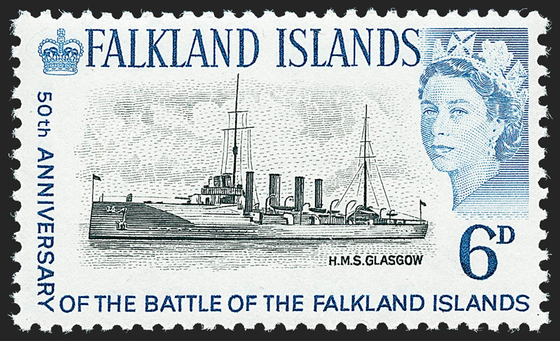 Editorial comment: Stefan Heijtz writes: The HMS Glasgow error is a 6d. postage stamp error produced for the Falkland Islands in 1964. The stamp issue commemorates the 50th anniversary of the 1914 Battle of the Falkland Islands and was a set of four stamps. The design error shows the incorrect ship, HMS Glasgow, instead of HMS Kent which was the ship shown on the normal 6d. stamps. HMS Glasgow normally appears on the 2 1/2d. stamps. Only one sheet of 60 stamps of the error was produced and it was sent to a stamp dealer in the United States who did not notice the mistake and distributed the stamps to his customers as part of normal sets. Only around 30 examples of the error have been discovered so far and it has a current market value of around £20,000 (in 2021).