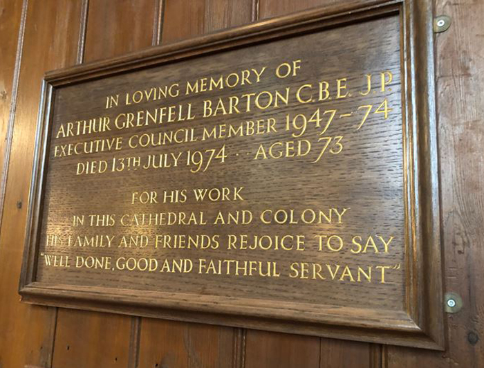 Barton retired from service on ExCo in January 1974 and died on 13 July 1974. Christ Church Cathedral where the Bartons had worshipped regularly was filled to overflowing for the funeral, for Barton was held in great affection and respect by all those who knew him and Governor Lewis recorded ' the Colony stood still'.