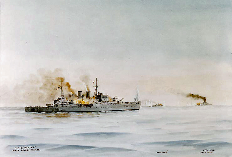On 2 December 1939, the Exeter and the light cruiser Ajax, Captain Woodhouse, flying the broad pennant of Commodore HARWOOD, were at anchor in Port Stanley. On hearing intelligence that the Graf Spee was in the South Atlantic, and anticipating that she would probably target shipping near the River Plate, Harwood sailed to intercept her and to rendezvous with the light cruiser Achilles.