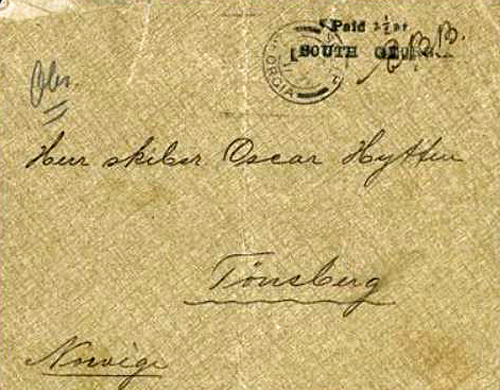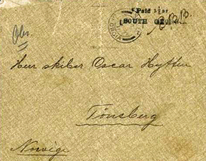 In 1911 the South Georgia whaling boom was at its zenith and it was also the period of the 'heroic age of Antarctic exploration'. In December 1911 the German expedition under Wilhelm FILCHNER called at South Georgia. Binnie later recalled that he ran out of postage stamps and had to improvise by making a 'Paid at South Georgia' handstamp, inserting the amount of postage. He again showed his skill with the camera, taking many outstanding images which were made into postcards and sold at the Binnie family's 'Orchid Store' in Stanley. In March 1912, he returned to Stanley and was employed on clerical duties in the Treasury. He also undertook a short tour of duty to West Falkland in a small mail boat, the Columbus, to investigate rumours of 'smuggling and the evasion of duty'.