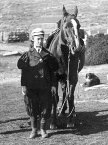 The children all learned to ride, for it was the only way to get from place to place. They had a long-suffering pony, Snipe, who lived in the house paddock, so was always available. Bridget says: 'When we were little, if we were going for a picnic, the things to eat would be packed in saddlebags and fastened on Snipe; the baby sat in front, and the older children took it in turns to ride behind and hold it on'. There is a photograph of Bridget as a girl with her horse, dressed in baggy trousers, gaiters and short boots.