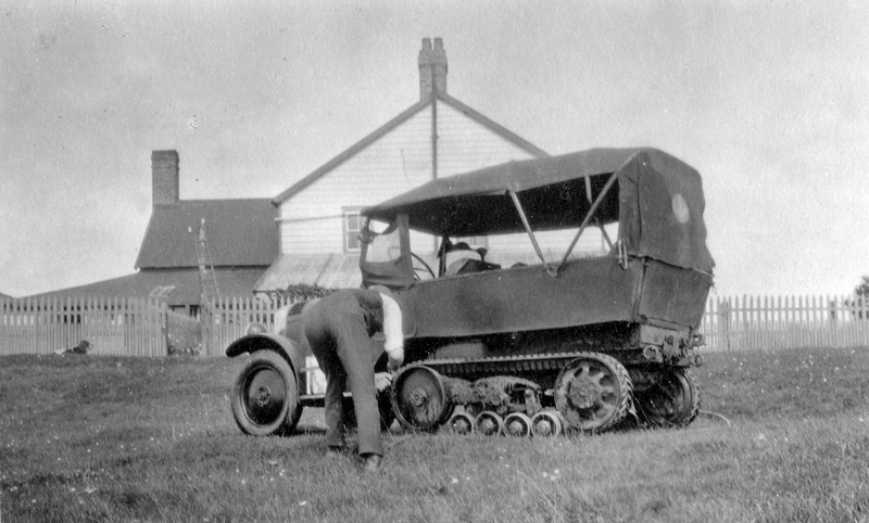 On his return to the Islands in 1919 he embarked on various projects to improve San Carlos. Housing was imported to improve living conditions for his staff, a hydraulic wool press was installed and he was also instrumental in introducing one of the first motor vehicles to the Islands. This was a Citroën-Kegresse half-tracked vehicle which had been developed by the Citroën Car Company of France to cross the Sahara. George imported one of these vehicles complete with driver in the mid 20s. Though not particularly reliable crossing the camp, it performed valuable service pulling a plough in subsequent pasture development round the settlement at San Carlos.