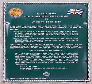 Dolphin was a 24-gun frigate, among the first Royal Navy vessels to be copper-sheathed, and was accompanied by the Tamar sloop. Their crews, unusually, were to be paid double wages, an act of generosity which the Admiralty later regretted as it struggled to avoid it being treated as a precedent for further discovery voyages. The ships left Plymouth in July 1764 under a subterfuge whereby Byron as commodore was officially bound for the East Indies where he was to take command of the station. After calling at Río de Janeiro Byron searched in vain for Pepys Island before sighting the 'high, ragged barren Rocks' of the northwest tip of West Falkland on 12 January 1765. Three days later he reached 'one of the finest Harbours I ever saw in my life', which he named Port Egmont after the first lord of the admiralty. The ships spent almost two weeks in Port Egmont, where the crews picked wild celery and other greenstuffs, hunted seals, penguins and sea-lions, and killed a hundred geese a day, while the surgeon of the Tamar planted 'a pritty little garden'. Before leaving, Byron took possession of 'this Harbour & all these Islands' in the name of George III, fired three salutes from the ship, and served the crew an allowance of brandy. He was also careful to note in his journal that Richard HAWKINS had already carried out an act of possession in 1593 (actually in 1594). Byron then sailed along the northern coastline of East Falkland to 'a very deep sound', which he named Berkeley Sound, but with 'a prodigious great Swell' threatening to carry the ships onto a lee shore they stood off to the north. If they had sailed up the sound to its head they would have found a French settlement, St Louis, established the previous year by Louis-Antoine de BOUGAINVILLE.