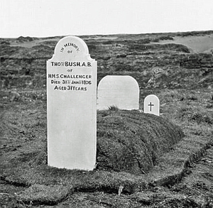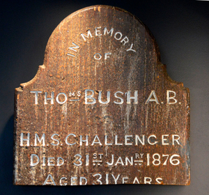 ‘At 10.30 P.M. on the 31st of January 1876, while the Challenger was at anchor in Stanley Harbour, Falkland Islands, in five fathoms of water, distant a quarter of a mile from the shore, Thomas Bush, an Able Seaman, fell overboard from the steam pinnace, which was coming alongside, and sank without uttering a cry. The night was dark, the weather very boisterous and raining. There was a short chopping sea (which rendered swimming extremely difficult), and an outsetting current.