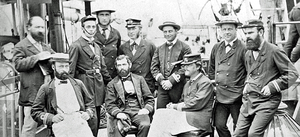 Lieutenant Carpenter, without a moment's hesitation, jumped from the gangway, and swam towards the spot where the man disappeared, which was some twenty feet from the ship, and touched him with his feet under water. He then dived, seized hold of Bush, and brought him to the surface, and supported him from three to five minutes; but Bush being a very heavy man, and encumbered with thick waterproof clothing, and, moreover, being quite insensible,