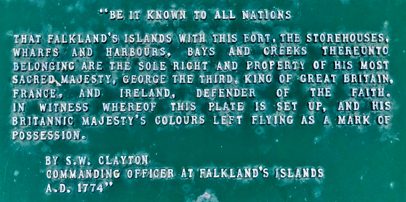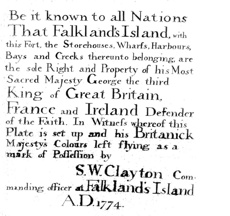 mark of possession by S.W. Clayton commanding officer at Falkland's Island