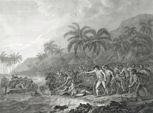 Cook decided to winter in the Hawaiian Islands, which he had named after his patron the Earl of Sandwich, before making a further attempt to find a northwest passage the following year. Cook anchored in Kealakekua Bay on the island of Hawaii on 17 January 1779. At first he was well received and by some accounts was considered by the Hawaiians as the embodiment of their God Lono. On 4 February 1779 Cook got under way to continue his survey of the islands but was forced to return to Kealakekua Bay for repairs after the Resolution's foremast was damaged in a violent storm. It soon became clear that his return was not welcome, culminating in the theft of the Discovery's cutter. On the morning of 14 February Cook landed with an escort of marines in an attempt, with less than his usual judgement, to persuade the local chief to return on board where he intended to hold him as a hostage against the return of the cutter. The chief readily agreed to accompany Cook, but at the landing place they were met by a hostile crowd and in the altercation that followed Cook and four of the marines were killed. Clerke, who now took command of the expedition, eventually managed to persuade the Hawaiians to return the majority of Cook's bones, which were put into a coffin and, on the afternoon of 21 February, were committed to the waters of Kealakekua Bay. Thus ended the life of Britain's greatest navigator and explorer.