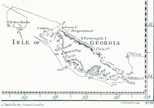 Because of its mountainous appearance Cook thought the land to be extensive and decided to explore its northern coast, which he reached by passing through Stewart Strait, between Willis and Bird Islands off its NW extremity. He then coasted along its north coast until 16 January, when he anchored for the night. The following morning he stood in for the land and when an inlet was sighted, Cook decided to explore it in the hope of finding a suitable anchorage. A boat was lowered and, with Cook leading the party personally, the approaches were sounded, but the depths were too great and it was decided not to bring the Resolution in. However, Cook landed 'in three different places, displayed our Colours and took possession of the Country in his Majesty's name under a descharge of small Arms', naming the inlet Possession Bay. The Forsters, who accompanied Cook, found only three plants, while some seals were killed to provide fresh meat for the ship's company. Numerous seabirds were sighted and also the first sighting was made of the South Georgian Teal (Anas georgica).