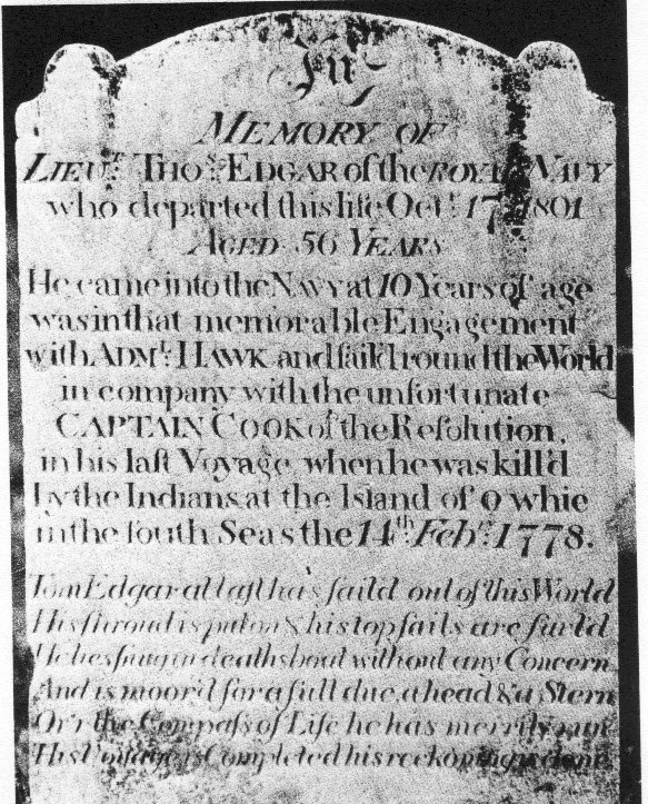 In 1789, Edgar was appointed naval agent on board the transport Lady Juliana, Captain Aitken, carrying over 200 female convicts to New South Wales. As a result she has been dubbed the floating brothel. During the voyage Edgar was described as a 'kind and humane man', borne out by the fact that only five convicts died on the voyage. He returned to England in the Dutch snow* Waaksamheyd, carrying plants from Governor Phillip for Sir Joseph Banks. In 1794, while serving in the Gorgon, Captain James Wallis, he was reported to be 'a good sailor and navigator, or rather had been, for he drank very hard, so as to entirely ruin his constitution'. From November 1795 until his death on 17 October 1801 Edgar was in charge of Dungeness Signal Tower on Romney Marsh. He is buried in the churchyard of All Saints, Lydd, Kent on the north side of the church. The inscription on his headstone, which, in 1995, was only partly decipherable, is taken from a photograph taken in 1903.