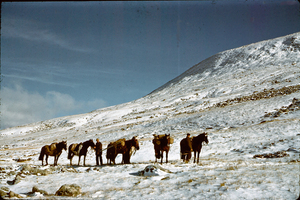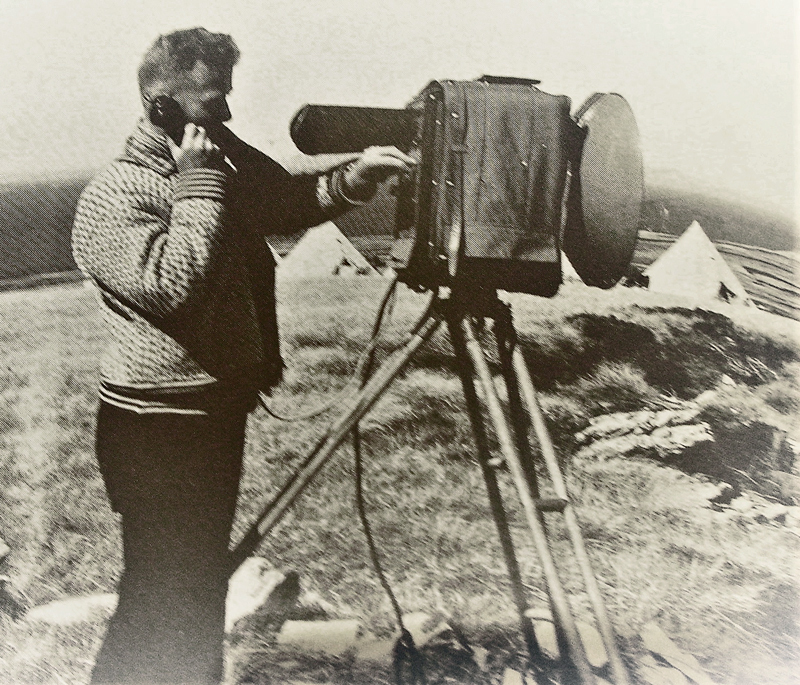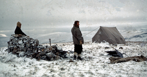 Ideal weather conditions for angular observations by theodolite were rare, the wind being a constant enemy. It was necessary to camp close to most triangulation stations in order to take advantage of any break in the weather which might occur. Few such stations were completed in less than a week, while several required up to three weeks camping on the highest hills in adverse conditions of wind, low cloud, rain and snow. Both surveyors worked as individual units each with the invaluable help of an Islands horseman.