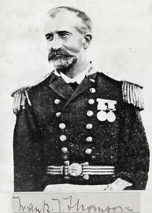 The ship arrived in the Falkland Islands from Sandy Point {Punta Arenas} on 23 January 1876 commanded by Captain Frank Tourle Thompson RN (who had succeeded Nares in Hong Kong). She had a total complement of 230 people, and she left the Falklands a week later, reaching Montevideo in Uruguay in mid-February 1876.