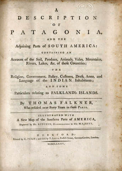 His book A Description of Patagonia, and the adjoining parts of South America ... and some Particulars relating to Falkland's Islands was published in Hereford in 1774. The Preface to this book places its composition in the context of the contemporary dispute between Britain and Spain over the Islands, and rather quixotically urges an alliance between the two countries. But only three of the book's 144 pages are devoted to 'Falkland's Islands': Falkner had not visited the Islands himself but had received accounts from Spanish officers who had 'received' the country from the French in 1767 and from a French gunner who was a fellow passenger on the Venus. The account is thoroughly depressing and indeed Falkner maintains that BOUGAINVILLE had intended to abandon his settlement at Port Louis, but had tricked the Spaniards into paying compensation for making it over to them. Falkner's work contains much interesting information on the South American Indians, derived from his missionary work among them, and is considered a classic. It was used by Charles DARWIN on the voyage of the Beagle.