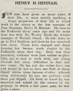 Hennah's obituary in the Falkland Islands Magazine and Church Paper of September 1909 reveals a thoroughly conscientious and able man who once ordered a flock of sheep to be dipped eleven times because contaminated sheep had been deliberately let into the same paddock. He was remembered as: 'An interesting man to talk to on any subject' and one who used 'his mechanical knowledge to simplify the difficulties of camp housekeeping' as well as to help his 'brother camp-managers'.