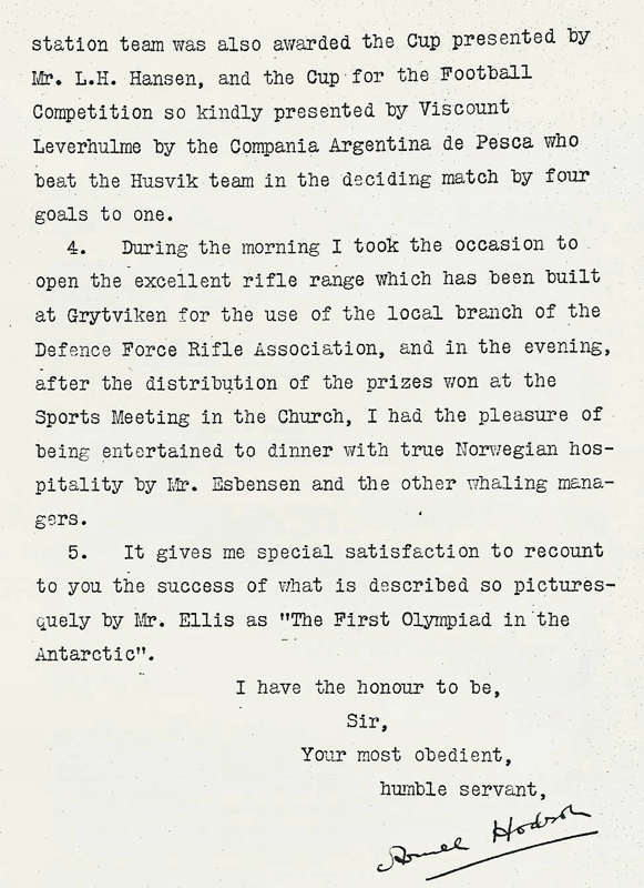 Despite his considerable achievements, it remains clear that Hodson’s decisions concerning the farming industry of the Islands were grave errors, which had serious long-term effects. Hodson also had a very poor relationship with members of the Discovery Committee, which had disastrous consequences for the regulation of the whaling industry. In May 1928 he wrote a 29-page despatch complaining about every aspect of the venture. The despatch can fairly be described as a diatribe; Hodson regarded the income from the whaling industry as the Falkland Islanders ‘birth right’ from which they were being deprived by the Discovery Committee.