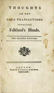 author and lexicographer, was born in Lichfield, Staffs on 7 September 1709, the elder son of Michael Johnson, bookseller, and Sarah Johnson, née Ford. He was educated at Lichfield Grammar School, the King Edward VI School, Stourbridge, and in 1728 he went to Pembroke College, Oxford, leaving in 1729 without a degree. Unable to earn a living as a teacher in the provinces, he moved to London in 1737 and embarked on a writing career. Beginning with a series of political pamphlets and parliamentary reports for the Gentleman's Magazine, his work over the next three decades was prolific and varied. In his sixties, encouraged by Henry Thrale, MP for Southwark, Johnson returned to political pamphleteering in support of the government of Lord North. Newly appointed Prime Minister by George III, North consolidated his hold on government as a result of the Falkland Islands crisis of 1770. In June of that year the Spanish seized the settlement at Port Egmont (West Falkland) ousting the British military garrison based there. In February 1771 North easily won a vote in Parliament for a diplomatic agreement which had been negotiated with Spain. Johnson's pamphlet Thoughts on the Late Transactions Respecting Falkland's Islands, was written in 1771. It was directly provoked by a letter written by 'Junius' (the anonymous pamphleteer and master of political polemic whose identity remains a matter of speculation).