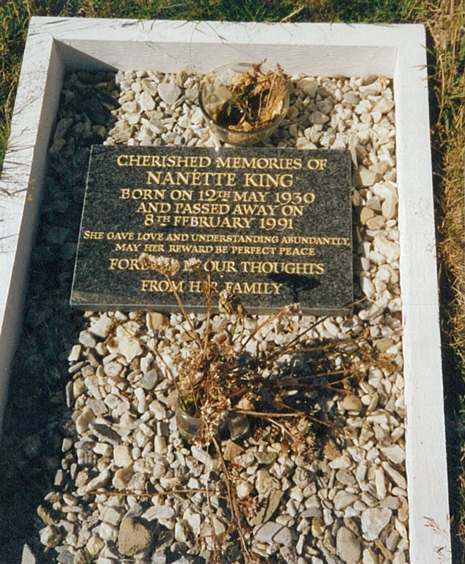 In 1987 the Upland Goose Hotel was sold to Witte Boyd, a British fishing company, and Ning and Des King retired, planning to spend their retirement between a new house in Stanley and a home in West Sussex. However, while in the UK, Ning was diagnosed with cancer, and she died soon afterwards on 8 February 1991. Her ashes were returned to the Falklands to be interred at Salvador, the farm she had always called 'God's Own Country.' A plaque in the Cathedral honours her memory and that of other members of the Pitaluga family.