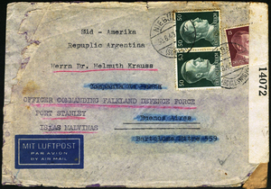 On 16 April 1941 an order to detain Helmuth Krauss under the command and control of the Magistrate at South Georgia was issued under the Falkland Islands Defence Regulations. He appealed against the detention on the grounds that although he was of German birth he was prohibited from re-entry to Germany (n.b. his German passport was stamped with a ‘J’) and that he wished to renew his contract with Compañia Argentina de Pesca and return to South Georgia.