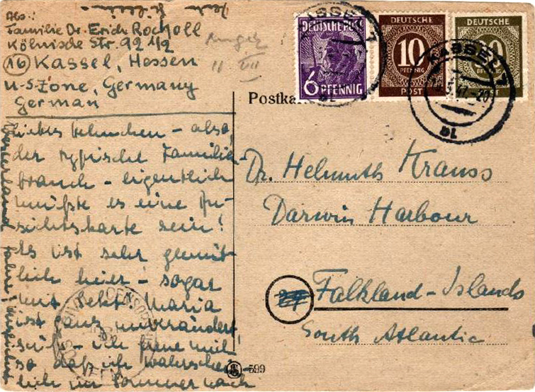 In September 1946 Krauss’s wife Maria was in the British Zone in Germany and had become unwell. He requested permission to send food parcels to her. This request was denied as it was contrary to the current regulations. While Krauss was at Darwin he received a postcard (see image 1969) from a number of his friends and relatives: