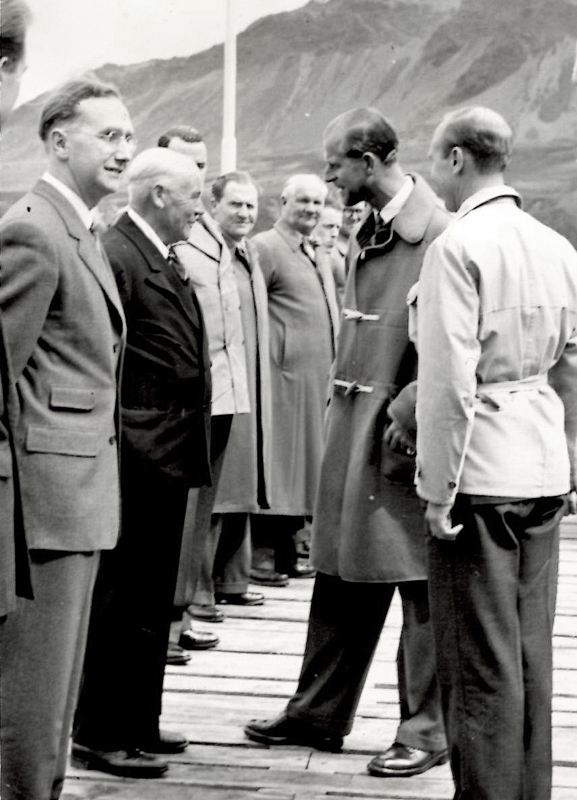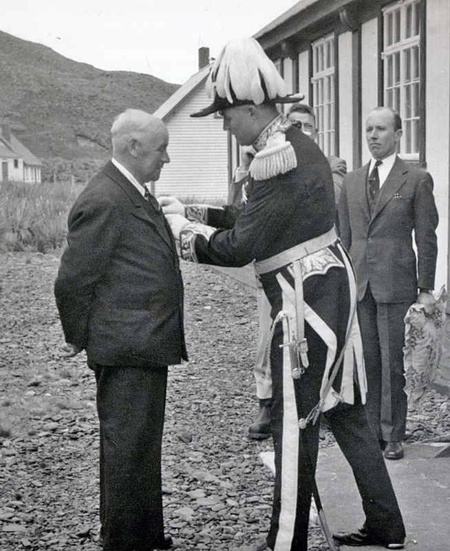 In the New Year Honours List for 1956, Hans Kristian Kristoffersen was awarded the MBE for his ‘services to the whaling industry at South Georgia’. He was officially invested with this award at a ceremony, undertaken on the steps of the magistrate’s house at King Edward Point, by the Governor of the Falkland Islands, Sir Oswald Raynor ARTHUR, on 12 January 1957, with the magistrate Robert Edward SPIVEY and the Governor’s aide-de-camp in attendance. This event coincided with the visit of the Duke of EDINBURGH to South Georgia, which formed part of his Royal Tour of the minor colonies, in the Royal Yacht Britannia and afterwards Hans was introduced to the Duke on the jetty at King Edward Point.