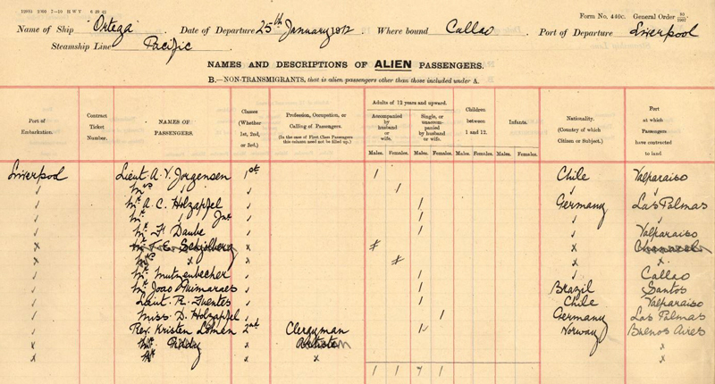 He began his theological studies in 1903, undertook military service in 1904 and was ordained as a priest in January 1912, following graduation at the University of Kristiania (Oslo). In 1911 Løken responded to an advertisement placed in the Norwegian press by CA LARSEN to serve as a priest and lecturer at South Georgia and was appointed later that year. It appears that this was a private arrangement between Larsen and Løken, not connected with the Norwegian State Church or the Seaman’s Mission. He may have been encouraged to apply for the job by his cousin Kristian Prestrud, who was first mate on Roald Amundsen’s polar expedition ship Fram. Løken made his way to South Georgia by crossing the North Sea by boat and onwards to Liverpool where he boarded the Pacific Steam Navigation liner Ortega for passage to Buenos Aires, where he was accommodated second class. At Buenos Aires he boarded the Pesca transport ship Harpon (Captain L. C. Larsen) and arrived at South Georgia on 1st April 1912. The inaugural sermon was held on Maundy Thursday.