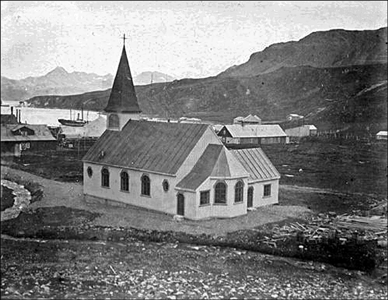 A small wooden Lutheran chapel, prefabricated by Strømmen Trævarefabrik, Norway, was purchased at a cost of 10,400 kroner (c £600) and shipped to Grytviken, where it was re-erected on open ground behind the factory, thereby becoming one of the most southerly churches in the world - complementary to the most northerly at Longyearbyen in Spitsbergen, which was also raised by Norwegians. The church was designed by Larsen’s son-in-law, architect Adalbert Kielland (1879-1956), who had married Larsens daughter Signe in 1907 in Buenos Aires; it had seating for 200 persons, a writing and reading room. A library was later installed.