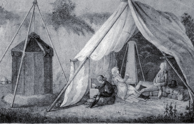 To achieve the best possible accuracy in the pendulum experiments Malaspina set up his observatory on the edge of the harbour some 400 yards from the previous site, where it was less exposed to the prevailing westerly winds. The foundations for the astronomical quadrant, which was set up in one tent, and for the pendulum, which was set up in an adjacent tent, were constructed of stones firmly stamped into the ground. Two chronometers were placed in the same tent as the pendulum, well above the ground to protect them from rising damp and frost. Although the weather interfered with the observations to some extent, in the end they were concluded satisfactorily. The site of the observatory was less satisfactory for rating the chronometers, the observations being frequently interrupted by hailstorms and SW winds.