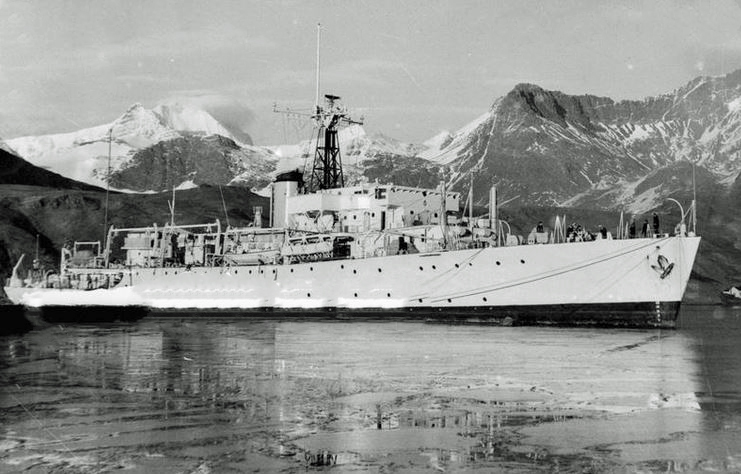 Matthew took the opportunity of going right round the Island twice, visiting every bay and, landing on Annenkov Island which few other than sealers had visited. At that time fur seals were to be found only on Bird Island. A man claiming to be an Argentine customs officer appeared in 1958 and again in 1959 arriving on a Compañia Argentina de Pesca transport ship from Buenos Aires. He rather naively said he had come to assume duty ashore in South Georgia. However he was required to remain on board ship while he was there, except once when he was escorted ashore by the policeman/handyman in uniform to the dentist's surgery at Grytviken for treatment and back on board again. The colonial secretary in Stanley was informed in the non-secure government telegraph code - enough to establish and make plain the position without fuss. Both the captain and the chief officer of the Pesca transport ship were seconded Argentine naval officers. They were cheerful company and the captain at least enjoyed the British connection in clubs in Buenos Aires.