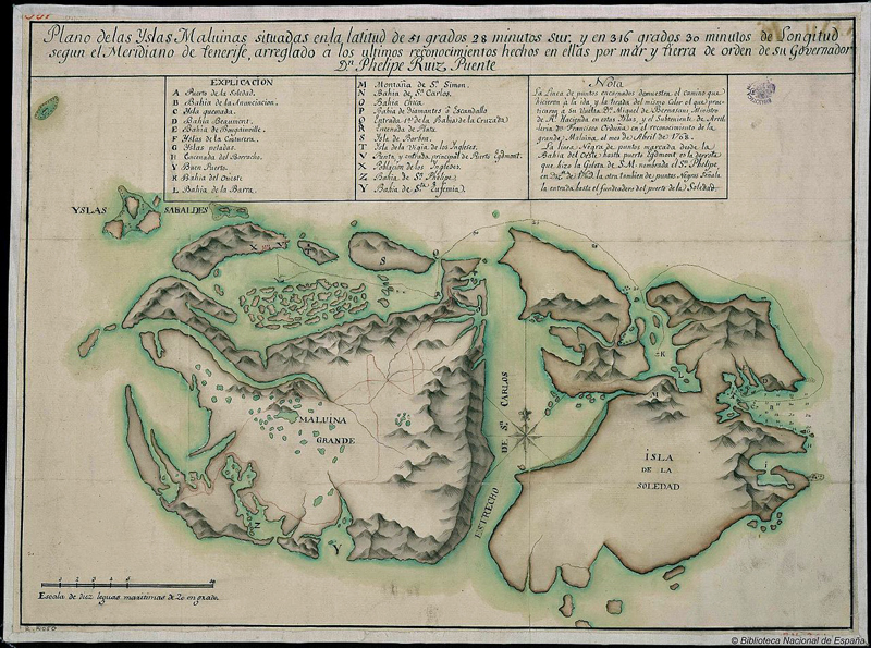 Spanish naval officer. Capitán de navío Felipe Ruiz Puente was the first Spanish comandante gobernador of the Spanish settlement at Puerto de la Soledad (Port Louis). On 17 October 1766 Ruiz Puente sailed from Ferrol with the frigates Liebre and Esmeralda commissioned to receive the Falkland Islands from BOUGAINVILLE in the name of His Catholic Majesty the King of Spain. After meeting Bougainville in the River Plate, Ruiz Puente sailed for the Falklands, entering Berkeley Sound on 24 March 1767, where Bougainville was waiting for him in the La Boudeuse. Bougainville relinquished command on 1 April and Ruiz Puente took possession and hoisted the Spanish colours on 2 April, when a 21 gun salute was fired at sunrise and sunset from both the ships and the shore. The Spanish officers viewed Port Louis settlement (which they renamed Puerto de la Soledad) with considerable dismay noting that the thirty-six 'buildings left behind by the French are not fit to be called houses, they are barracks;' only the house left by the French commander was built of stone and thatched with straw. It is not known what steps Ruiz Puente took to rectify this situation or to strengthen Spanish sovereignty.