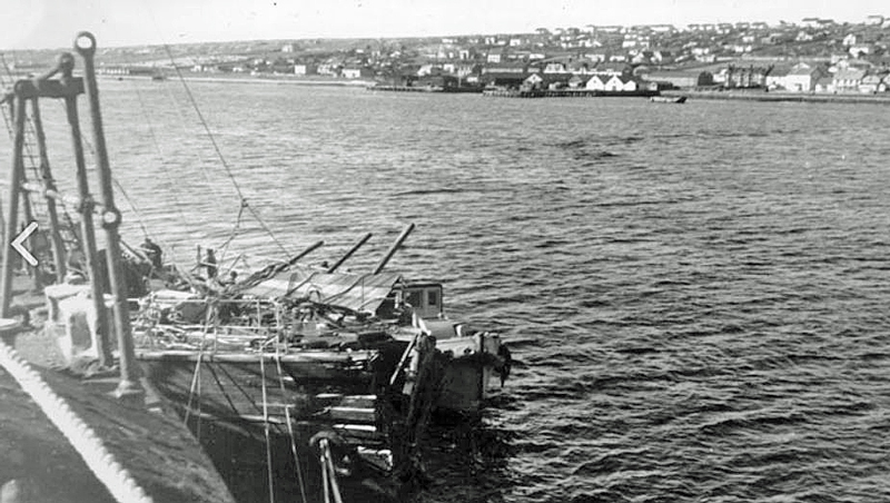 Trepassey left St John’s on 20 November 1945 carrying three of the Eagle’s crew, a second load of fifty-five huskies from Labrador under the supervision of FIDS members Surgeon Lieutenant R C SLESSOR, and sub Lieutenant T P O’Sullivan, Sheppard’s son Robert Austin in the crew, and wife Sadie who accompanied them as far as Montevideo. Stopping only at Recife and Montevideo, Sheppard brought Trepassey into Stanley on 31 December 1945 after a voyage made eventful by the decomposition of whale meat carried as food for the huskies!