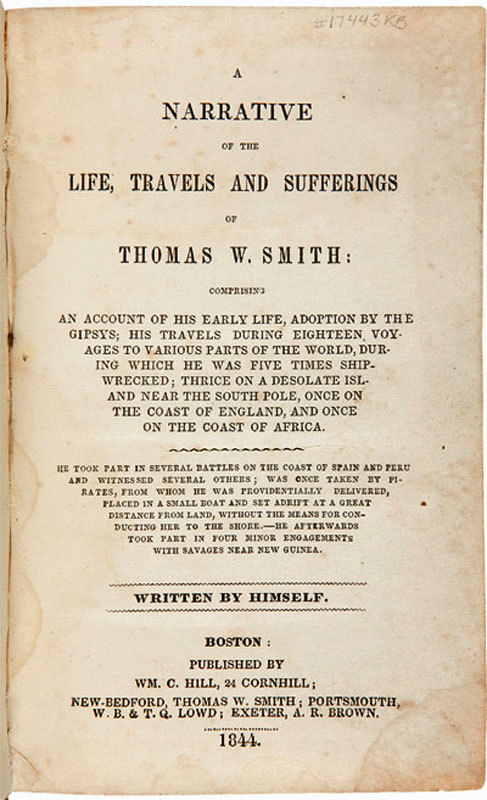 A Narrative of the Life Travels and Sufferings of Thomas W. Smith comprising an account of his Early Life, Adoption by the Gipsys; his Travels During Eighteen Voyages to various parts of the World, During which he was five time Shipwrecked; thrice on a Desolate Island near the South Pole, once on the coast of England and once on the coast of Africa. He took part in several Battles on the coast of Spain and Peru and witnessed several others; was once taken by Pirates, from whom he was Providentially Delivered and placed in a small boat and set adrift at a great distance from land, without the means for conducting her to the shore, he afterwards took part in Four Minor Engagements with Savages near New Guinea.