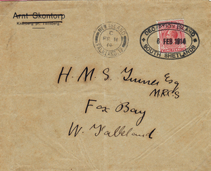 The doctors serving on West Falkland Island were also put in charge of the post office, which served as a shop, a meeting place, a liquor store and where births and deaths were registered. Mail and provisions arrived from Stanley by boat three times a month. Dr Stanley-Turner’s mail orders from the UK were nearly always for photographic material (he processed his own photographs), and journal notebooks in which he wrote a number of articles and books. Educational books were also sent out from the UK to enable him to home-school his four children.