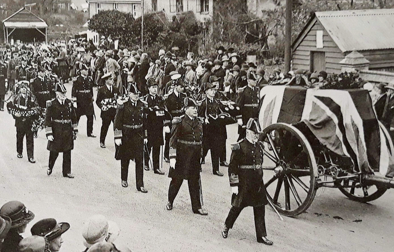 At Sturdee's funeral which took place at St Peter's Church, Frimley, there were no less than eight admirals as pall bearers, one of whom was Sir Richard Phillimore, the commander of Inflexible at the battle.