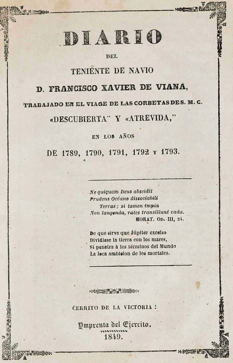 His diary, (Diario del viage explorador de las corbetas españoles Descubierta y Atrevida en los años de 1789 á 1794), giving brief details of Malaspina's two visits to Port Egmont, was published in Montevideo in 1849 'by Francisco Javier de Viana and other sons of the author', with a reprint in two volumes published in Montevideo in 1958.