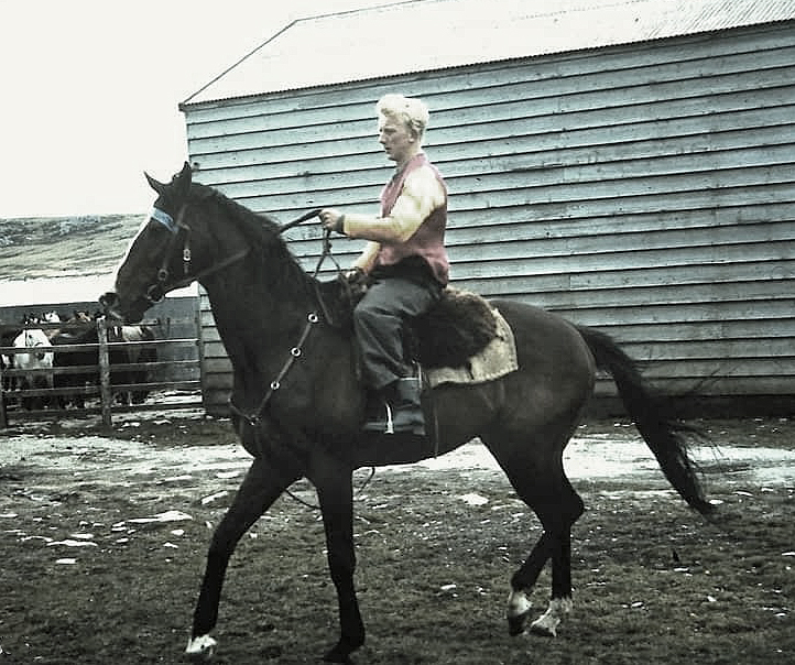 His love for horses began at an early age and his friend and classmate, Eric Goss, recalled that he was given a horse called ‘Shannon’ which originated from Port Howard, which the two boys would ride out on Stanley common whenever the opportunity presented itself. The boys even managed to escape from church one Sunday morning having convinced their parents that they had said their prayers before playing truant. Not content with riding their own horses they would often borrow a couple from the large troop of horses which congregated on Stanley Common and ride bare-back, hanging onto the horse’s mane, whooping and shouting as they galloped around south of Stanley.