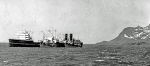 Throughout February and March Weller was responsible for the parish of Port Stanley, as the dean was on leave. He lived alone in the Deanery, but he found life somewhat frustrating. "There was nothing for me to do, a few sick people to visit and a few services to take". He could not leave town as there were no roads ... At the beginning of April there came a chance to break the monotony. A ship was going to South Georgia and he was offered the opportunity to visit the southernmost part of his diocese. No bishop had ever been there before. though a former dean had visited the island some years previously. ... One morning he took a Communion service for ten people in the Magistrate's drawing room - "no one remembered when there was a previous service " ... Another highlight of his visit was a trip out to a huge whaling factory ship, the British-flagged Svend Foyn. The only way to get on to the 22,500 ton ship was by going up a rope ladder which was covered in whale grease, "the stench was anything but pleasant." He was shown all over the ship and given an excellent lunch; the Norwegian food made a welcome change from the everlasting mutton he usually lived on in those parts.